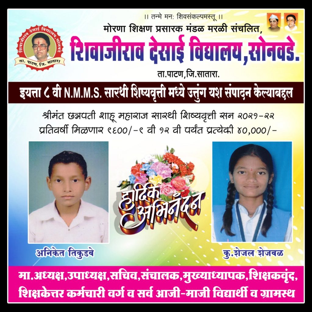 इयत्ता आठवी NMMS सारथी शिष्यवृत्तीमध्ये उत्तुंग यश संपादन केल्याबद्दल अनिकेत तिकुडवे आणि कु. शेजल शेजवळ यांचे हार्दिक अभिनंदन …!!!